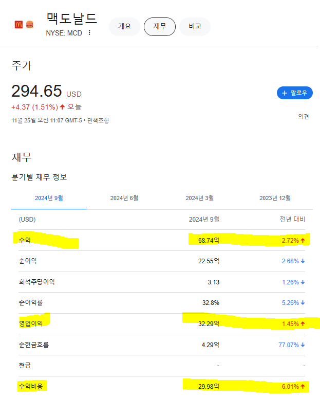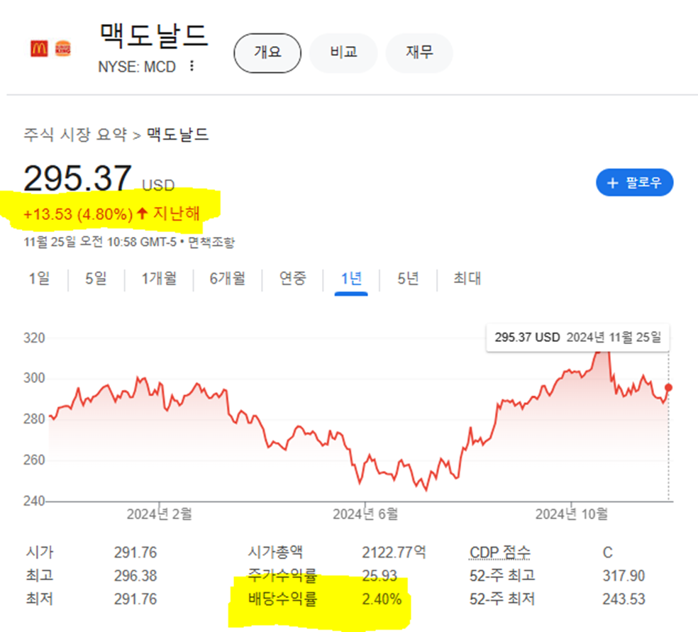 맥도날드는 지난 2분기 어닝쇼크가 있을만큼 실적이 부진했지만 최근 발표한 3분기 실적에서는 매출과 영업이익이 다시 회복되었습니다. 주가는 연초 대비 4.8%정도 상승했어요. 2분기의 실적부진 때문에 주가가 하락했었지만 다시 회복한 모습입니다. 프랜차이즈 사업 모델은 맥도날드의 핵심 성장 동력으로, 리스크를 최소화하면서도 꾸준한 수익을 창출할 수 있게 해줘요.
