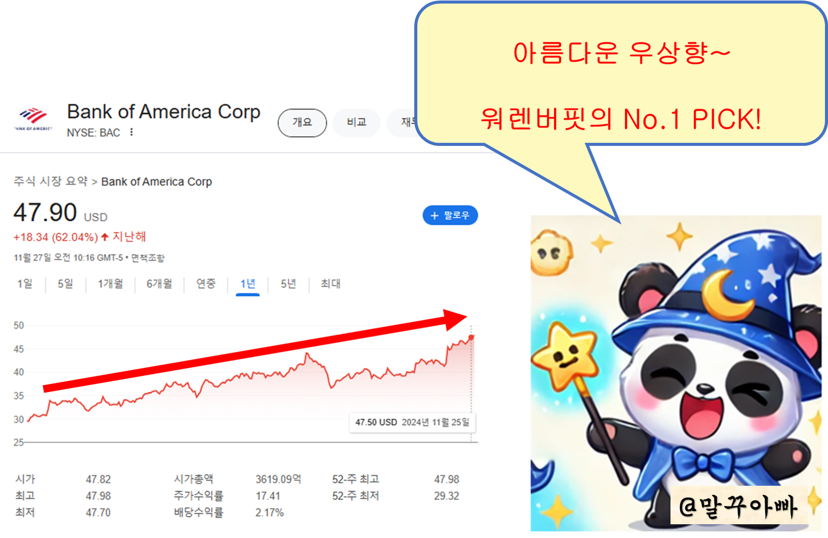 워렌 버핏이 오랫동안 뱅크오브아메리카를 보유하고 있는 이유는 이 회사가 가진 강력한 브랜드 파워와 안정적인 금융 시스템 덕분입니다. 장기적으로 볼 때, 뱅크오브아메리카는 금융업에서 꾸준히 성장하고 안정적인 수익을 창출할 수 있는 회사로, 장기 투자에 적합한 기업임에 틀림없습니다.