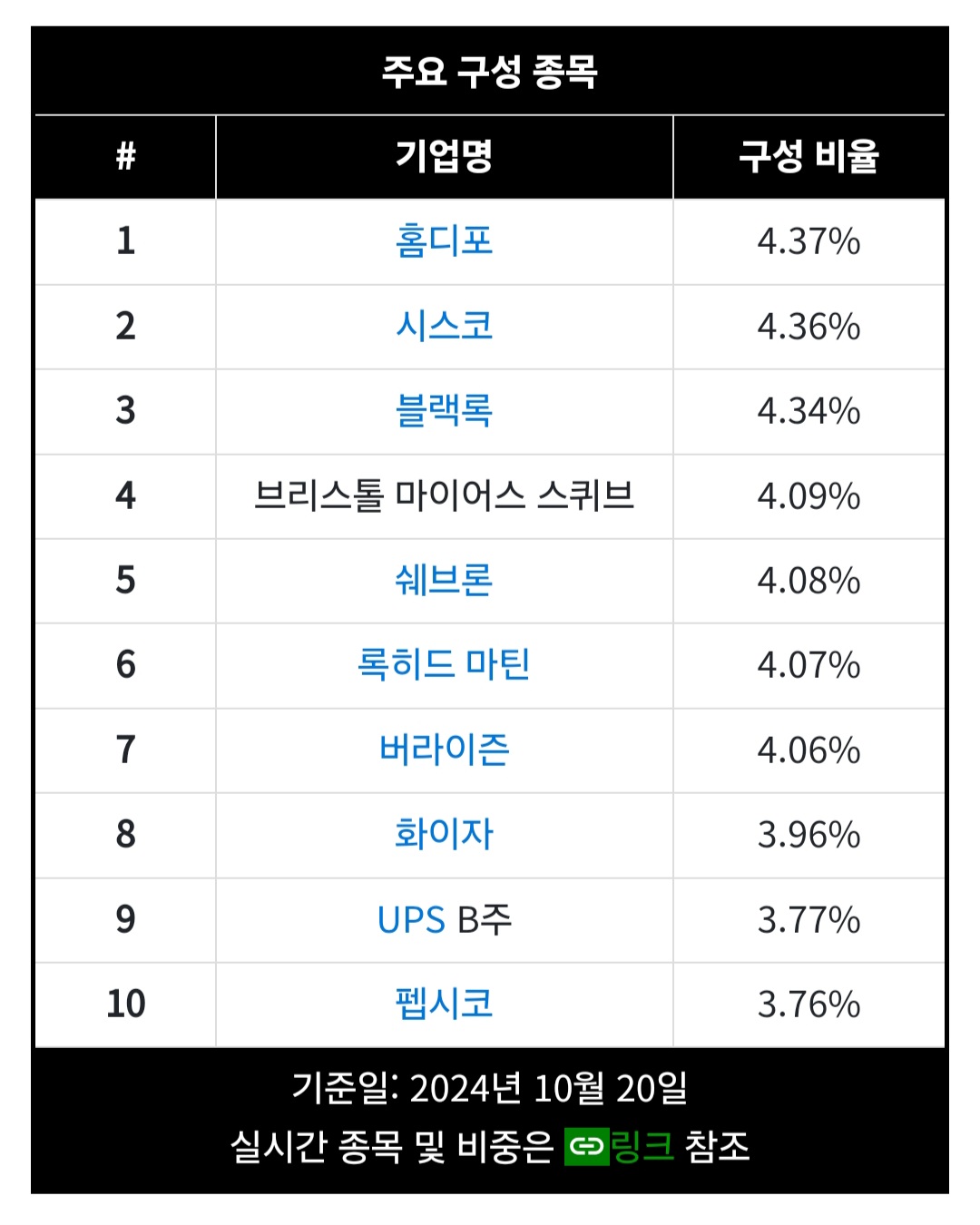 2024년 기준 상위 10대 종목은 다음과 같습니다: