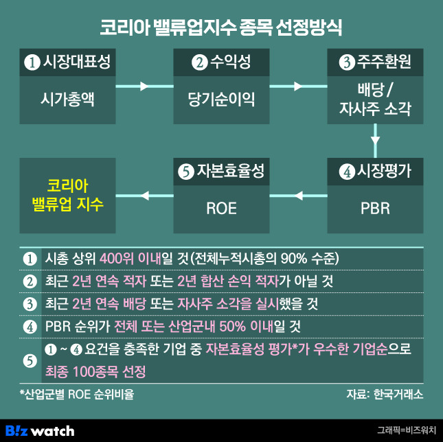 코리아 밸류업 지수는 PBR과 ROE가 산업군별 상위에 속하거나, 꾸준히 배당을 지급하며 주주 가치를 제고하는 등 다양한 요건을 갖춘 100개 기업으로 구성됩니다. 기업 선정에는 총 5단계의 평가 절차가 적용됩니다. 먼저 시가총액 상위 400위 내의 기업 중에서 2년 연속 적자가 없는 기업들을 추려내며, 이후 주주 환원 성과(배당 또는 자사주 소각)와 자본 효율성을 평가하여 선정합니다. 최종적으로는 산업군별 상대평가를 통해 각 산업의 대표성을 갖춘 기업들이 포함되도록 했습니다. 이는 일본의 JPX 프라임150과는 차별화된 방식으로, 산업군에 대한 상대평가를 도입하여 특정 산업군이 배제되는 문제를 방지했습니다.