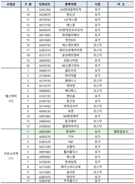 코리아 밸류업 지수는 각 산업군별로 골고루 분포된 기업들로 구성되어 있으며, 산업군별로는 △정보기술 24 △산업재 20 △헬스케어 12 △자유소비재 11 △금융·부동산 10 △소재 9 △필수소비재 8 △커뮤니케이션 5 △에너지 1종목으로 구성되었습니다.