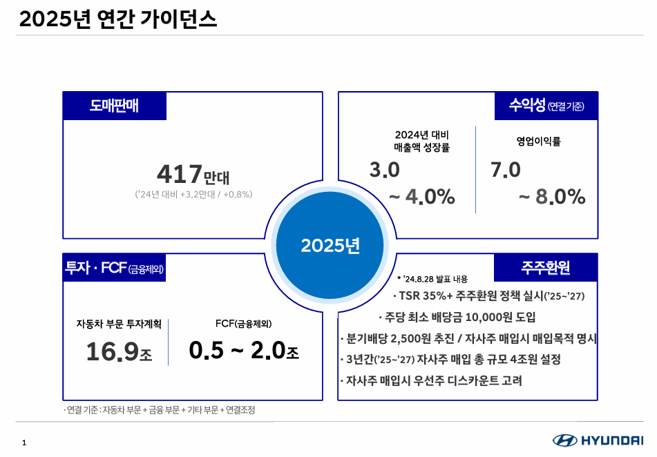 현대차는 앞으로도 하이브리드 & 전기차 비중을 확대하며 친환경차 시장에서 강자로 자리 잡겠다는 계획이에요! 2025년에는 417만대를 판매하겠다고 목표를 세웠는데요. 이는 2024년 대비 13% 증가한 판매량이랍니다. 또한, 제네시스를 더욱 키우면서 수익성을 높일 예정이라고 해요. 2024년 대비 매출은 3~4% 정도 성장을, 영업이익률은 7~8% 정도를 유지하겠다고 발표했습니다.