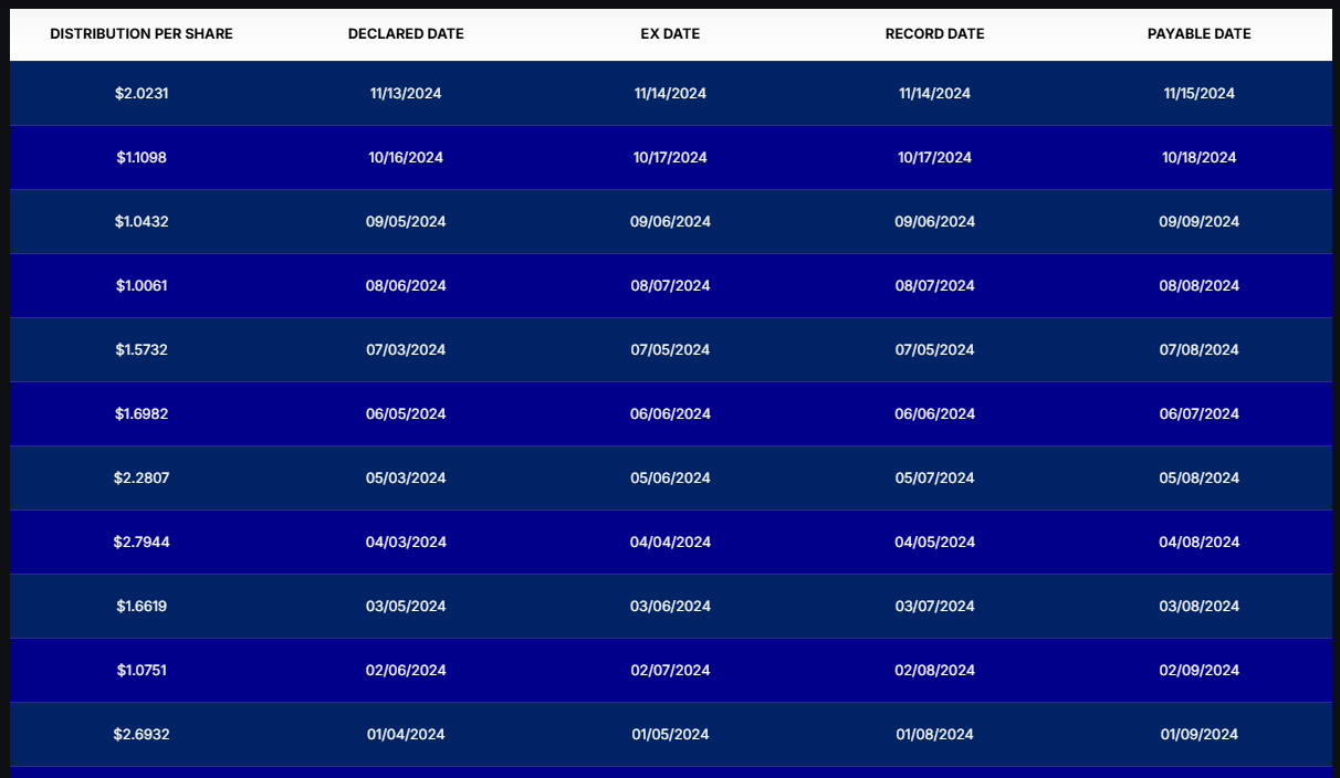 코인베이스 본주 주가에 비해 CONY ETF 주가는 연초 대비 약 29%가 하락하면서 주가 흐름은 좋지 못했지만, 꾸준히 높은 배당금을 지급하며 연간 120%의 배당률을 유지하며 투자자에게 매월 안정적인 현금흐름을 안겨주었습니다. 물론 배당률을 포함하더라도 코인베이스 주가에 비하면 수익률이 낮기는 하지만, 트럼프 대통령의 당선으로 인한 최근 급등현상을 제외한다면 연간으로 봤을 때 코인베이스 주식보다는 CONY ETF 의 수익률이 더 좋았습니다.